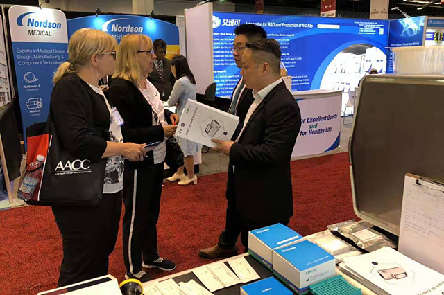 展会开始第一时间,便有合作伙伴登门拜访,与中翰盛泰的代表交流彼此需求,探讨合作事宜。有许多在医疗领域不同研究方向的专家、学者对肝素结合蛋白项目表达了浓厚的兴趣。值得一提的是,还有幸获得了中华医学会检验分会前主任委员、美国AACC会员潘柏申教授的鼓励。他说:我国做出口的企业有很多,但是能在美国能够站稳脚跟的却凤毛麟角,希望你们以肝素结合蛋白为契机,稳步前进,做出高质量的POCT产品。浙江专家陈瑜教授,郭希超副院长也在百忙中莅临展位现场,送来关爱,并对中翰盛泰走向国际市场的决心表示赞赏,期望不久的将来能够收获硕果。