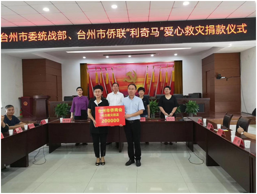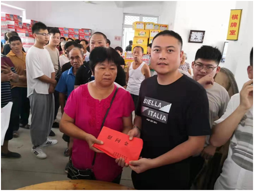 理事李选(右)向灾民送上慰问金
