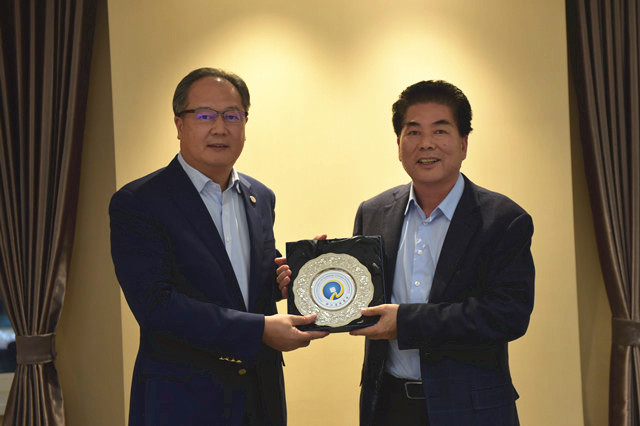 廖春荣会长(左)向陈志远会长赠送纪念品