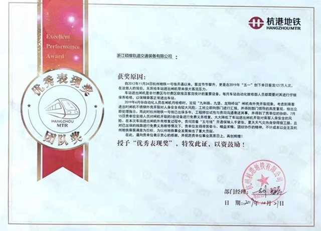 杭州杭港地铁有限公司对硕维轨道公司在杭州地铁1号线项目中,不计成本以业主及杭州地铁乘客满意为目标的做法,给予高度评价和衷心感谢,并提出表扬,这是硕维轨道公司在2019年创造的又一傲人佳绩。