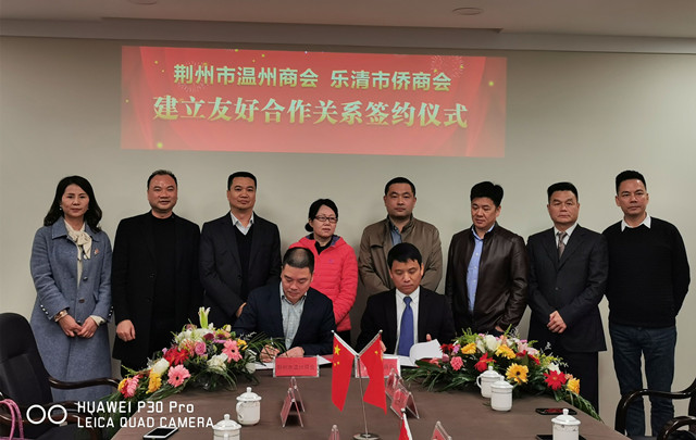 近日,乐清市侨商会与荆州市温州商会建立友好合作关系签约仪式在湖北荆州举行。乐清市侨商会会长李方西,监事长吴方忠,常务副会长倪兴川,副会长刘安德、高松桂、谢明海等一行13人赴湖北省荆州市考察,并拜访了荆州市温州商会。荆州市工商联主席罗中平和乐清市委统战部部务成员顾立文出席签约仪式并讲话。签约仪式由荆州市温州商会常务副会长郑志平主持。