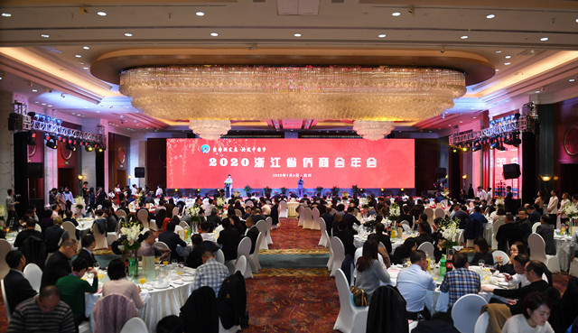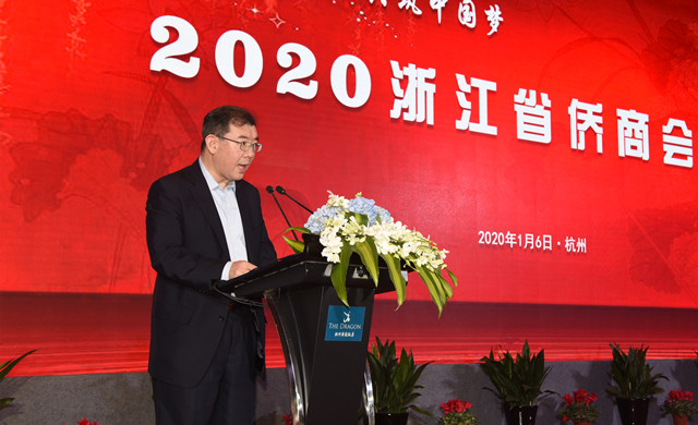 廖春荣会长在致辞中说,2019年是省侨商会成立的第13个年头。面对国内外复杂的经济形势,我们认真学习习近平总书记在民营企业座谈会上的重要讲话,不忘初心,开拓创新,各项事业再创新业绩,多项工作走在了全国侨商组织前列。一是坚持高质量发展,把科技创新作为发展第一动力,继续引领服务会员和侨商企业转型升级、创新发展取得新成果。有 90多家会员企业和侨商企业被授予市级以上“科技创新企业”等荣誉称号。贝达药业、江丰电子、诺尔康神经电子科技、尚越光电等一批高科技和创新发展的优秀企业,为全省侨资企业树立了榜样。二是积极发挥侨商组织的独特优势和作用,努力为国家发展大局服务,引导广大侨商参与“一带一路”建设、助推长三角一体化发展、努力为国家自贸区建设服务等取得新成绩。全年省市侨商会共组织590多家会员和侨商企业参加了海内外各类洽谈会和项目对接会,共达成“一带一路”投资意向项目130多个。三是努力为会员和侨商企业服务,拓展会务工作呈现新局面。开展“访侨企送服务”活动,建立侨商会内部合作机制,以“抱团取暖”的方式化解侨企在转型升级发展中的难题。举办侨商企业用工招聘会,帮助协调处理侨商经济纠纷案件,为侨商事业发展保驾护航。组织会员代表出席中国侨商联合会第五届会员代表大会、第十五届世界华商大会和第五届世界浙商大会等,促进了与海内外侨商组织的交流和合作。四是履行社会责任,参与助力脱贫攻坚行动和社会公益事业作出新贡献。为提高贫困地区人口就业能力和推进贫困地区教育事业发展,省侨商会捐助举办了贵州纳雍县董地乡的红色主题夏令营和汽车驾驶员培训班;组织会员和广大侨商向遭受超强台风“利奇马”严重影响的温岭、临海、仙居、永嘉、乐清等地捐款捐物达1350多万元,赢得了灾区政府和群众赞誉。
