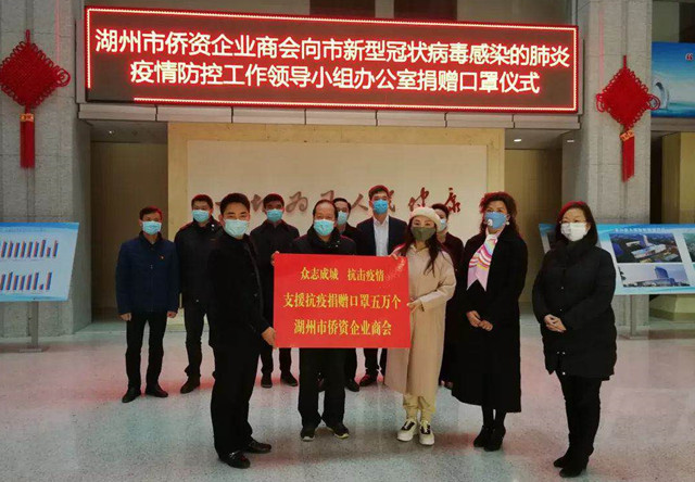 2月1日,湖州市侨商会向市新型冠状病毒感染的肺炎疫情防控工作领导小组办公室捐赠了5万只口罩,将定向捐赠给湖州相关区县和医疗机构。市委统战部常务副部长李晓良,市侨办主任、侨联主席王青,市卫生健康委主任饶如锋及市侨商会常务副会长钱凯、黄亚琴、理事唐丽代表出席捐赠仪式。