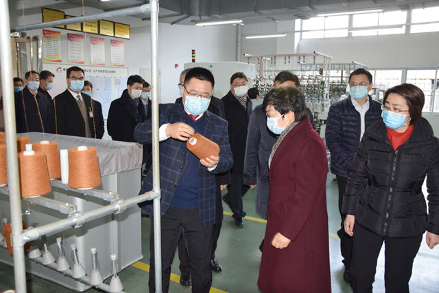 接着,在薛惊理的带领下,陈奕君一行相继参观了精品羊绒粗纺生产车间和高档花式纱线生产车间。在进入粗纺车间时,现场所有来宾被一块写着“热烈欢迎康赛妮人返厂复工”字样且有着各种笔迹、各种振奋人心话语的宣传板深深吸引。这是抗击疫情期间,康赛妮员工们自动自发地在这块宣传板上,写下自己的肺腑之言,表达了与公司风雨同舟、坚持、进攻、永不放弃、共抗疫情的心声!陈副省长深受感动,对康赛妮人斗志昂扬共克时艰的精神大加赞赏!