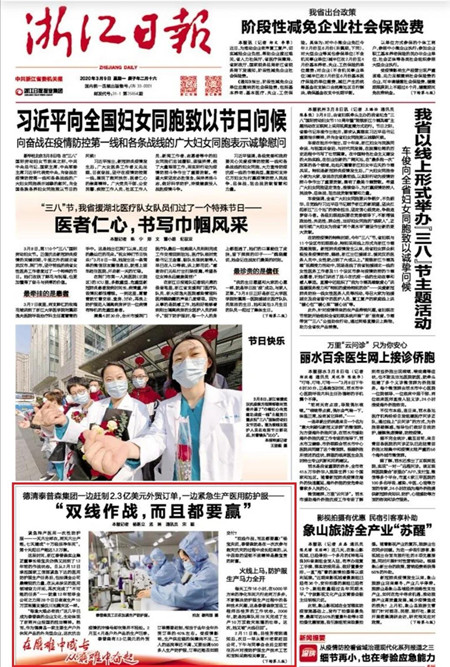 《浙江日报》头版刊发《德清泰普森集团一边赶制2.3亿美元外贸订单,一边紧急生产医用防护服——“双线作战,而且都要赢”》