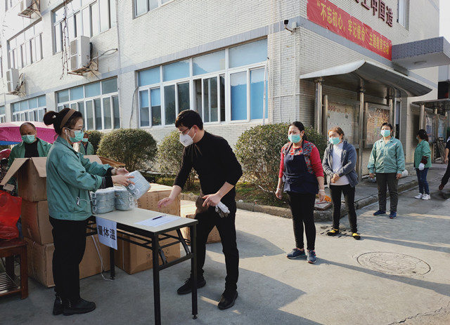 发放礼品现场,大家自觉排成一队,中间间隔一米,有序的领取礼品。(乐清市侨商会)