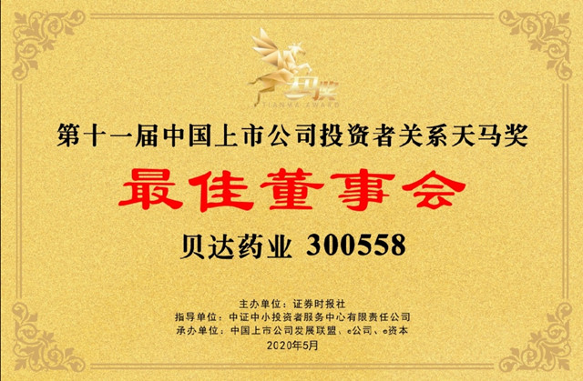 近日,由证券时报社主办、中证中小投资者服务中心指导的“第十一届中国上市公司投资者关系天马奖”榜单出炉。江南体育app下载安卓 常务副会长单位贝达药业股份有限公司荣获“创业板最佳董事会奖”,公司行政总裁、董事会秘书童佳女士获评“创业板最佳董秘”。
