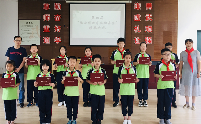 六一儿童节当天,海盐县六里小学报告厅内洋溢着喜悦的氛围。在欢快激昂的音乐声中,第四届“陆云彪教育奖励基金”颁奖典礼拉开帷幕,嘉兴市侨商会常务副会长、浙江云广印业股份有限公司董事长陆云彪分别为获得“品学兼优奖”、“励志学生奖”的29名学生颁发教育奖励基金,鼓励学生们勤奋学习,早日成才。