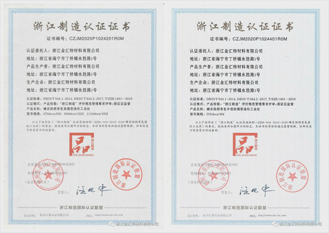 近日,嘉兴市侨商会理事单位——浙江金汇特新材料有限公司生产的磷系阻燃有色高强型、中低收缩型涤纶工业丝两项产品顺利通过“浙江制造”产品认证现场评审,喜获“浙江制造认证证书”,获授权使用浙江制造“品”字标志。“品字标”浙江制造认证证书的取得,是公司获“海宁市市长质量奖”之后的又一殊荣。