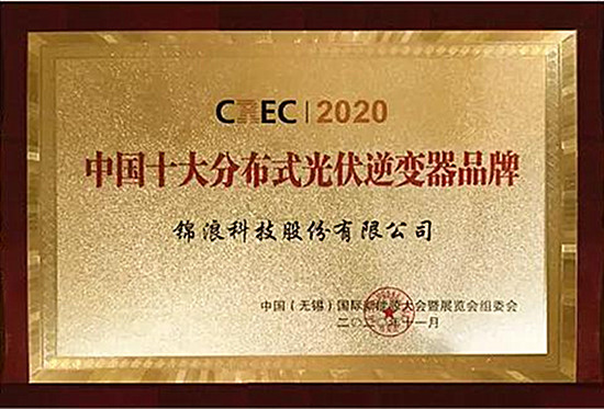 在11月4日举行的第十二届中国(无锡)国际新能源大会暨展览会(CREC2020)上,锦浪科技股份有限公司凭借高效可靠的产品和始终如一的服务,荣膺“2020中国十大分布式光伏逆变器品牌”,锦浪科技已连续多年斩获此荣誉。