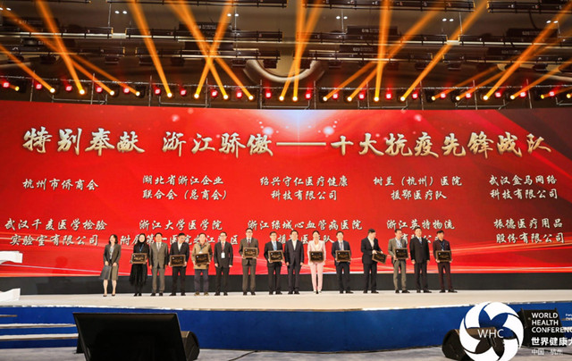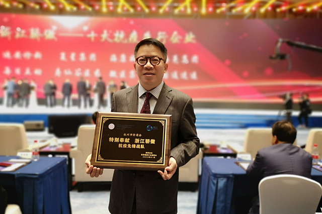 杭州市侨商会被大会授予“特别奉献 浙江骄傲 十大抗疫先锋战队”荣誉称号,杭州市侨商会监事长方杰代表商会上台领奖。