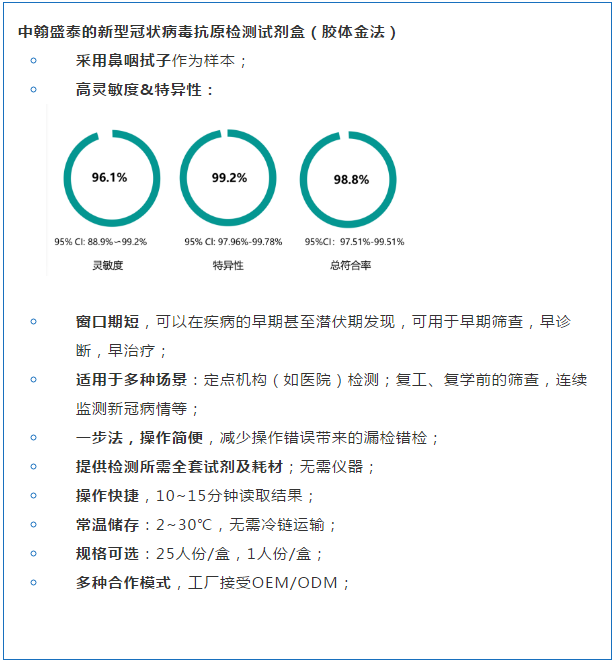 中翰盛泰的新型冠状病毒抗原检测试剂盒(胶体金法)已获欧盟CE认证、商务部出口白名单,列于欧盟新冠解检测决方案数据库、世卫WHO-FIND创新基金会表列,还通过了德国PEI检验。(中翰盛泰)