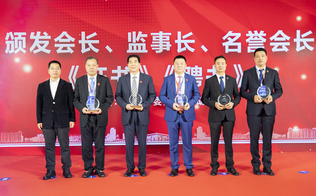 新当选的瑞安市侨商协会会长董邦云(左四)等上台领证
