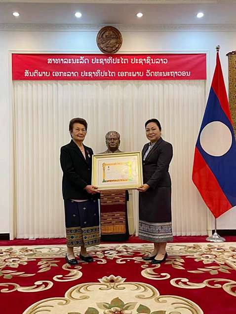 老挝驻华大使坎葆(右)为肖赛香(左)颁发勋章及荣誉证书