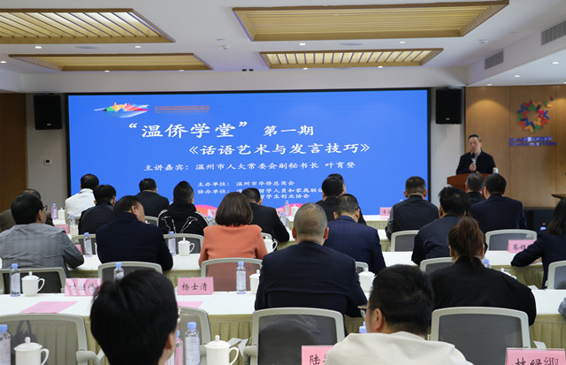 最近,由温州市华侨总商会主办,温州市留学人员和家属联谊会和温州市留学生创业协会协办的“温侨学堂”在世界温州人家园17楼瓯说厅正式开讲。温州市人大常委会副秘书长叶育登作为第一堂课的主讲嘉宾,为现场观众带来了主题为《话语艺术与发言技巧》的课程。
