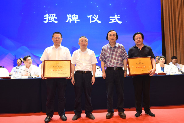 傅根友部长(左二)、姜敏达秘书长(左三)分别为会长李和林(左一)、荣誉会长严水清颁证