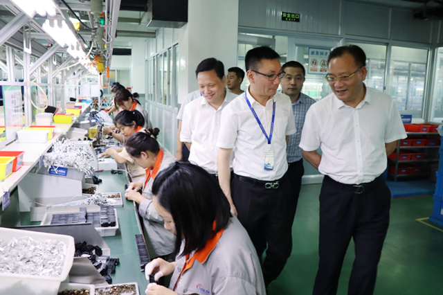 在金龙电子公司,赵明皓一行实地参观了金龙电子数字展示中心、自动化车间及研发实验中心,了解了该公司的企业文化和环境建设。随后座谈会上,吴金龙详细介绍了公司的产业布局、技术创新、智能化生产、数字化应用及新能源项目等方面内容,并提出遇到的困难与问题。