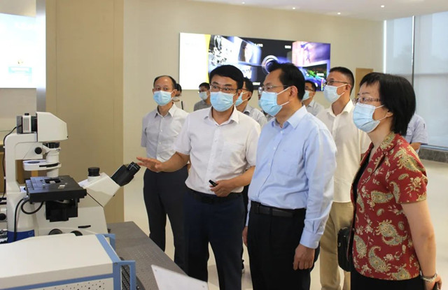 裘东耀一行详细听取了毛磊总经理就公司发展历程、生产经营情况以及重大科技创新成果等情况汇报。在公司承制的中国首台“太空显微实验仪”前,毛磊自豪地向裘市长汇报了项目的研制过程。目前航天员已在“天和”核心舱完成了该设备的安装和调试,正在太空中等待着科学家们来使用。随后,裘东耀一行又参观了公司元件事业部,详细了解了精密光学元组件产品的生产流程、设备及人员配置情况。