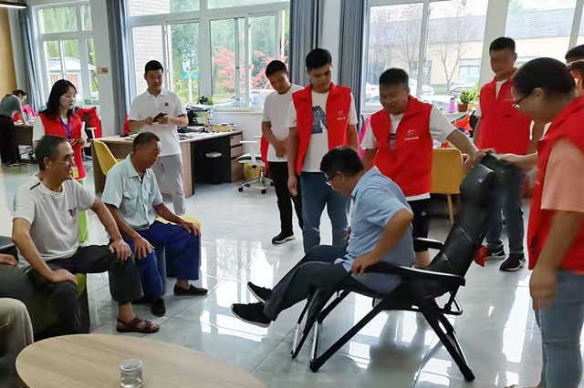 一早,泰普森七彩先锋10名志愿者来到狮山社区,向社区的退役老兵送上节日祝福与慰问品——“我飞”折叠椅,志愿者们向老人们热心展示折叠椅,耐心讲解产品功能及使用方法,亲身体验产品的舒适度。志愿者们与退役老人们拉家常、一起重温峥嵘岁月。现场氛围温馨、其乐融融,前辈老兵、青春少年齐唱《我和我的祖国》,共祝祖国繁荣昌盛。