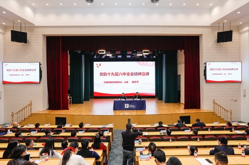 近日,宁波市政协党组书记、主席徐宇宁到宁波诺丁汉大学,向学校师生和来自教育界、科技界、对外友好界的部分政协委员宣讲党的十九届六中全会精神。宁波侨商会政协委员会客厅牵头委员徐旭昶、薛惊理,会客厅团队成员朱海宏、朱叶俊杰参加了此次活动。