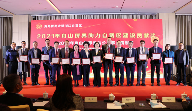 活动中,舟山市侨联授予舟山市侨商会“2021年舟山侨界助力共同富裕贡献奖”;舟山市绿佳园林工程有限公司、舟山市方丝制衣有限公司、舟山市乔鸿家居用品有限公司等14家市侨商会会员单位被授予“2021年舟山侨界参与公益事业贡献奖”。市侨商会及5家侨商企业与4个县区的6个村签订了“千侨团(企)帮千村”结对帮扶协议,助力乡村振兴,共建海岛特色美丽乡村。