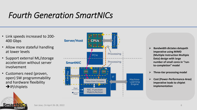 会上,芯启源首次对外公布了芯启源“SmartNICs第四代架构”。英特尔前副总裁,今年年初加盟芯启担任研发副总裁的Jim Finnegan介绍说,SmartNIC为当今的网络提供了更高水平的可扩展性、灵活性和性能,而芯启源基于DPU芯片的第四代SmartNIC则提供了高度的可编程性,以及极度灵活的可扩展性处理,能够适应于各个应用场景,满足不同客户的定制化需求。虚拟化,独立于服务器主机;支持大规模并行处理的MIMD架构;可支持200Gbps速度的多个链路;可编程性和灵活性等这些都是芯启源智能网卡第四代架构的特点。