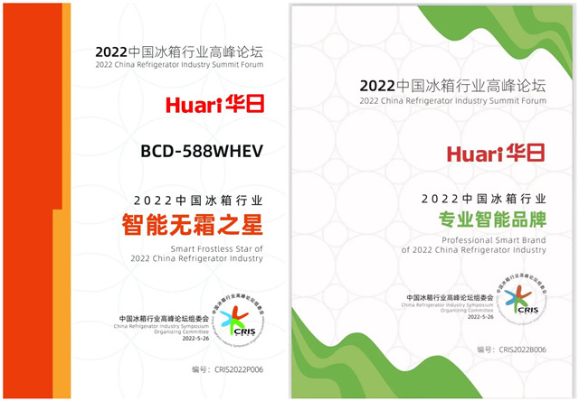 监事长单位浙江华日实业投资有限公司凭借在高端智能科技技术上的优异表现,一举摘取“2022中国冰箱行业专业智能品牌”称号。同时,华日旗下的BCD-588WHEV荣获“2022中国冰箱行业智能无霜之星”奖。