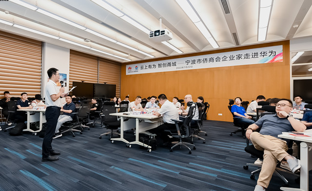 副会长、宁波市侨商会会长薛惊理带队走进华为全球培训中心开展交流活动,市侨商会名誉会长兼执行会长朱海宏,常务副会长沙力、傅炵,副会长徐鉴之、徐继钢、张益波等20余人参加。