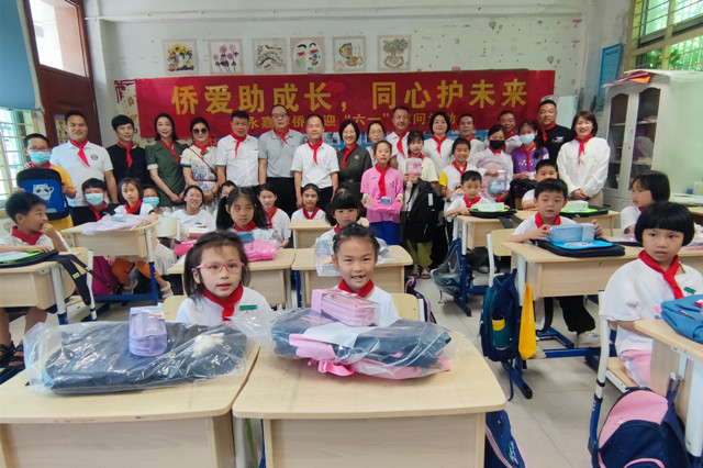 慰问组一行为白沙小学70多名儿童一一送去了书包、篮球、文具等学习用品,和孩子们一起庆祝节日的到来,鼓励孩子们好好学习、快乐成长,并祝福他们节日快乐。据学校校长介绍,白沙小学70多名学生中,留守儿童比较多,其中双亲都外出打工的留守儿童有40余位,并有20多位学生是侨界儿童。虽然父母不在身边,但孩子们如果在生活和学习中会碰到困难,都会有学校和老师们的帮助,所以家长们能够放心、安心地在外创业发展。