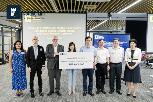 近日,宁波诺丁汉大学(以下简称“宁诺”)校友捐赠仪式在学校图书馆举行,宁波市侨商会青年委员会成员陈涵将一百万元人民币的捐赠牌递交到宁诺党委书记、教育发展基金会理事长沈伟其教授手中,这是宁诺首次接受来自校友的百万元捐赠。