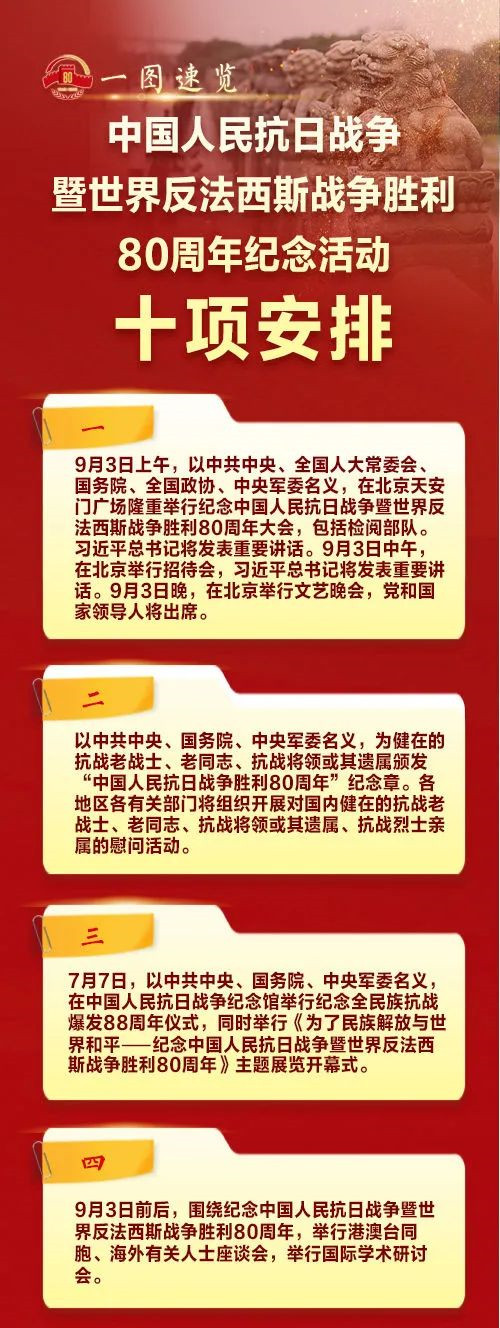 9月3日上午,中共中央总书记、国家主席、中央军委主席习近平将出席纪念中国人民抗日战争暨世界反法西斯战争胜利80周年大会并发表重要讲话。