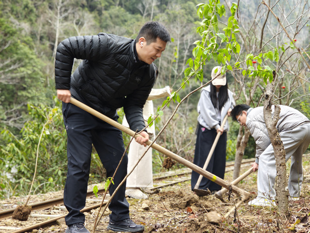 迎着春日的暖阳,侨青会员们抵达灵韵仙境,大家纷纷挽起袖子,挥锹铲土、挖坑翻土、扶苗培土,现场一片热火朝天的劳动景象。经过辛勤劳动,一棵棵樱花树苗沿着轨道旁迎风而立,“侨心林”初具雏形。每一株都承载着侨青会员们对家乡的深情——根系深植永嘉沃土,来年花开烂漫时,将成为一道靓丽的风景线,寓意着“侨青扎根永嘉、枝叶连世界”。