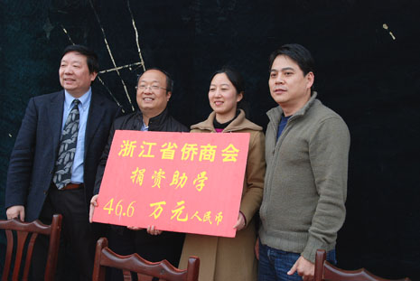 捐助苍南县平等辅导小学综合教学楼建设协议书”,并与副会长陈志荣、黄镇鑫一起向苍南县副县长章月影送交捐助资金。随后举行了奠基仪式。