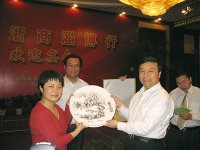 淄博市领导向省侨商会副会长吴晶(左)赠送纪念品
