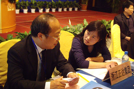 省侨商会常务副会长陈侠(左)在淄博招商洽谈会上
