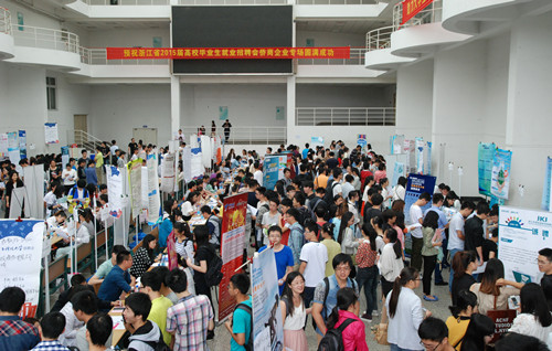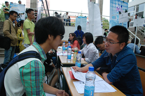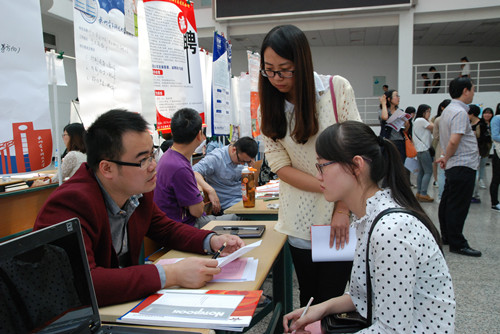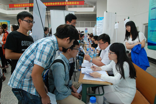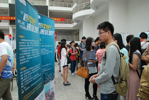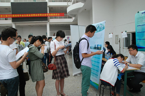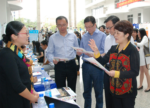吴晶主席(右一)、岑国荣书记(右二)、张维仁副主席(左二)等在招聘会现场