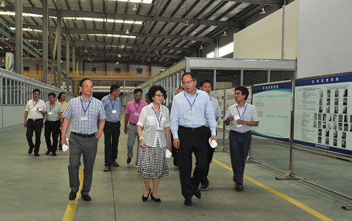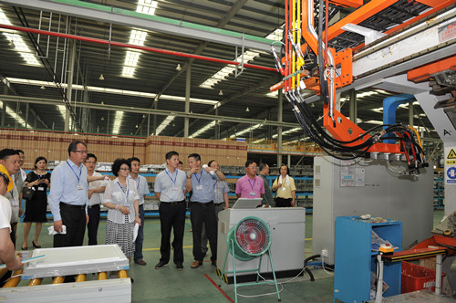 廖春荣(前左三)会长一行在陈励君董事长(前左二)陪同下参观冰箱制造车间