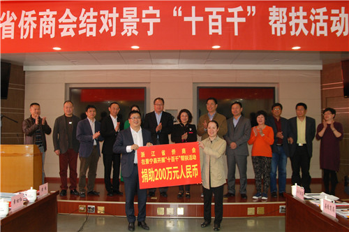 四、省侨商会在革命老区景宁畲族自治县开展“十百千”帮扶活动。为响应党中央、国务院关于“广泛动员全社会力量,合力推进脱贫攻坚”的号召,4月1日,省侨商会走进国内唯一的畲族自治县---丽水景宁县革命老区开展“十百千”帮扶活动,即帮助10所农村学校改善生活设施、100户困难家庭脱困、1000个农村劳动力转移就业,同时送去了200万元人民币的帮扶资金,把温暖送给畲乡困难群众,受到当地政府和群众的赞誉。