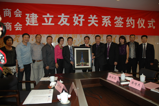 10月22日,法国浙江商会会长蒋正平率访问团一行19人到访温州。当天下午,举行了温州市侨商会与法国浙江商会建立友好合作关系签字仪式。温州市侨商会会长翁银巧以及杨小龙、黄加珍、刘光华、邵武、李大乐等15位会长团成员与法国浙江商会代表团进行了座谈。温州市侨办副主任周三荣主持签字仪式。