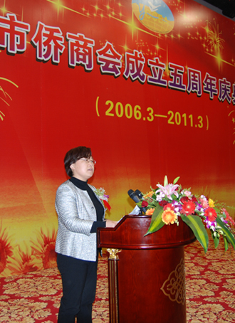 刘芸在庆典大会上致辞。她代表省侨办、省侨商会,向乐清市侨商会领导和全体会员致以诚挚的问候和良好的祝愿。刘芸指出,乐清是著名的侨乡,也是侨资企业较为集中的地区。乐清市侨商会成立五年来,紧紧围绕办会宗旨,在为经济建设服务和为会员事业发展服务方面,做了大量工作,积累了一定的经验;在促进侨商联谊交流、维护权益、引进人才、合作发展等方面发挥了积极的作用,为乐清的经济建设和社会发展做出了重要贡献。她希望乐清市侨商会不断总结经验,发扬成绩,再接再厉,在信息交流、维护权益、引资引智、合作发展等方面,努力为广大会员提供优质、便利的服务,特别是要坚持科学发展,应对复杂多变的国内外经济形势,更加努力地为广大会员企业和侨资企业加快转变经济发展方式、实施“走出去”战略做好服务工作,为“十二五”经济社会发展开好局、起好步。她要求全省各级侨务部门和有关部门要围绕省委、省政府的全局工作,发挥侨务工作的优势,切实关心和支持各级侨商会的工作,积极促进侨资企业的发展壮大,为浙江改革开放和经济社会发展作出新的、更大的贡献。