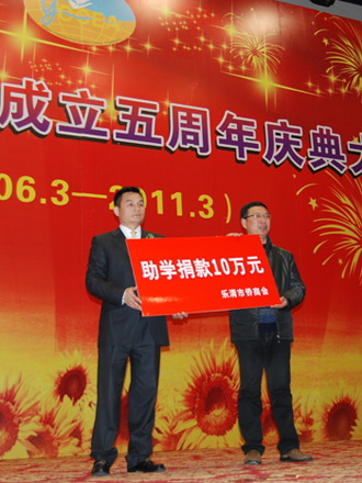 庆典大会还举行了结对助学捐赠仪式。吴方忠代表市侨商会向乐清中学捐助10万元人民币,以资助贫困学生求学。(省侨商会)