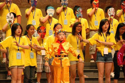 大会堂里歌声飞扬、舞姿摇曳,掌声阵阵。由全体采三营员齐上阵的中国功夫,虽说是“现学现卖”,但有模有样,赢得阵阵喝彩;文澜营的“东成西就”,颇有创意地将夏令营学的几招中国太极与西方街舞相融合,中西文化在同一舞台上交相辉映、同放异彩;温州营的时装秀“中国风”巧妙地将温州本土文化元素融入世界潮流之中。当身着旗袍、洋装的营员们展开“中华寻根乡音永存!”的字幅时,全场响起了雷鸣般的掌声和欢呼声,经久不息。营员们精彩的表演将联欢会推向了一个又一个高潮。
