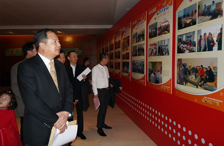 廖春荣会长观看侨商会五周年发展历程