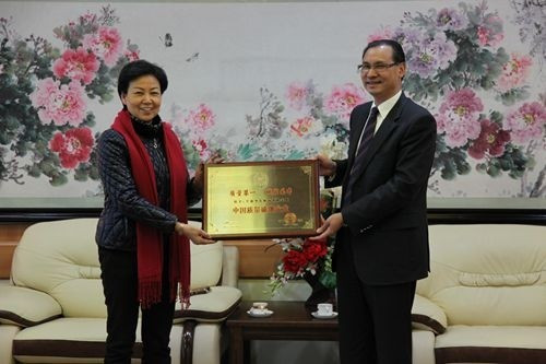 宁波出入境检验检疫协会会长符丽萍(左)授牌于斐戈集团董事长施云(右)