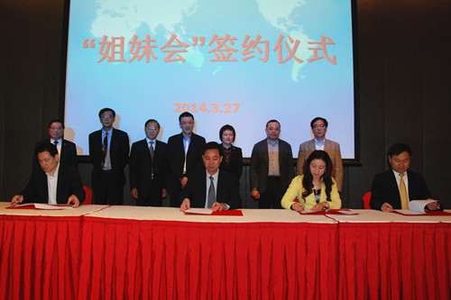 江南体育app下载安卓 副会长戴其丰(右一)与上海市华商会副会长蔡红专(右二)在友好商会协议书上签字