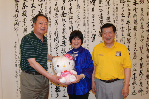 廖春荣会长(左)向李昌钰夫妇展示主题乐园Hello Kitty 形象