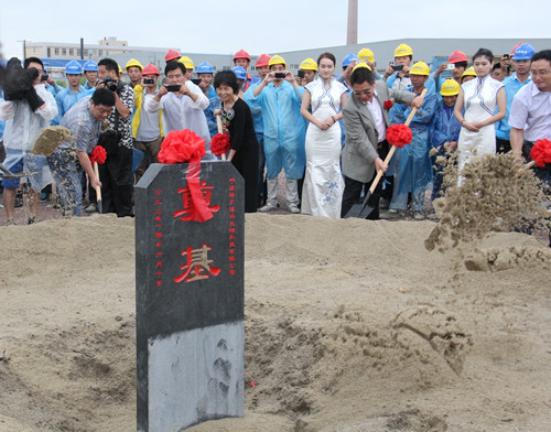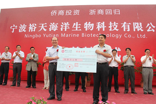 包荣升(前左)代表公司向石浦镇政府捐赠50万元人民币用于“五水共治”