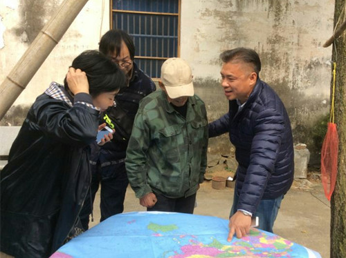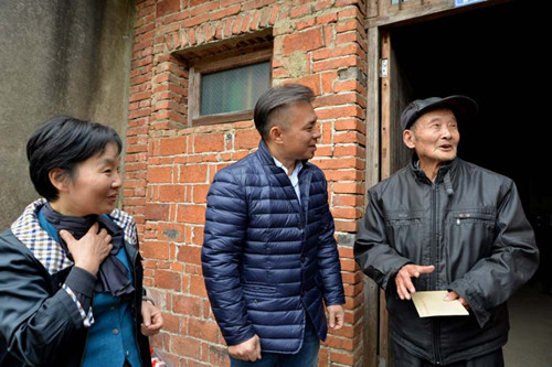 周海波副会长一行在浬浦村看望了94岁国军抗战老兵金乃忠,“金爷爷,你要多留意腿脚,走路要当心!”周海波一边嘱咐老人一边送上慰问金,他和志愿者们一起查看了老人在战场上被子弹贯穿过的右腿,并细心地弯腰帮老人撸好裤脚;还看了老人当年战斗过的山洞照片,一起回忆60多年前戎马往事。在东白湖镇看望了95岁钟艺救国军老兵蔡裕郎、94岁老兵赵先苗和89岁远征军老兵陈仲瑜,周海波还与陈仲瑜老人一起在石桌上摊开一张世界地图查看老人当年的远征线路,周海波也比划起图上的路线风趣地说:“自己也是‘远征军’,从意大利往浙江两头跑。”