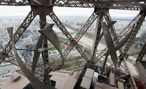 电控对于风力发电装置而言,相当于其心脏。宁波锦浪新能源科技有限公司主要为该发电装置配套了控制器和并网逆变器,前者用来控制电流,后者则起到将直流电逆变成交流电且并入电网的作用。电控装置上不仅有中国制造的英文字样,正中间还清晰地印着锦浪的logo。据悉,埃菲尔铁塔二层处安装的这两个风力发电装置,每个高7米、宽3米,被垂直安装在铁塔二层距离地面127米处,总发电量为每年1万千瓦时,可满足首层商店的日常用电需求。为了不影响美观,两个风力发电装置外观均被刷成与铁塔钢架结构相同的颜色,令其与塔身融为一体。
