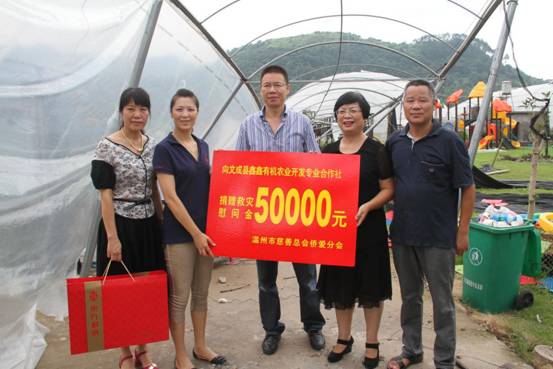 在意大利归侨郑璐女士创办的文成县鑫鑫有机农业开发专业合作社,一场台风,把一年的劳动成果“洗劫一空”。葡萄等果实打落得满地都是,蓝莓、玉米等大批倒伏,作物严重被淹,大棚等农业设施损毁严重,损失惨重。许捷一行详细了解灾情后,送上慰问金和慰问品,并鼓励郑璐女士要振奋精神,尽早投入灾后重建中。